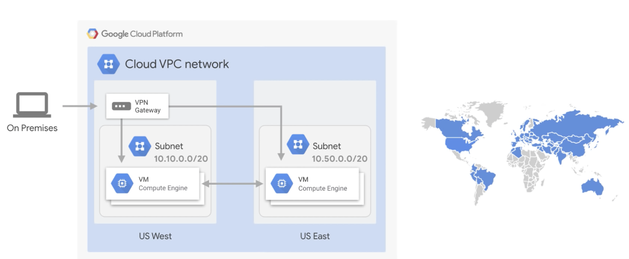 GCP의 제일 큰 특징은 VPC가 특정 리전에 제한되지 않는 점 VPC자체에 IP주소 지정이 없다. 글로벌 VPC로 대륙, 국가가 달라도 되는 점 즉 1개의 VPC에 여러 나라의 서브넷으로 구성이 가능 AWS가 미국 오하이오 VPC, 서울 VPC로 나뉜다면 GCP는 미국 오하이오 서브넷, 서울 서브넷