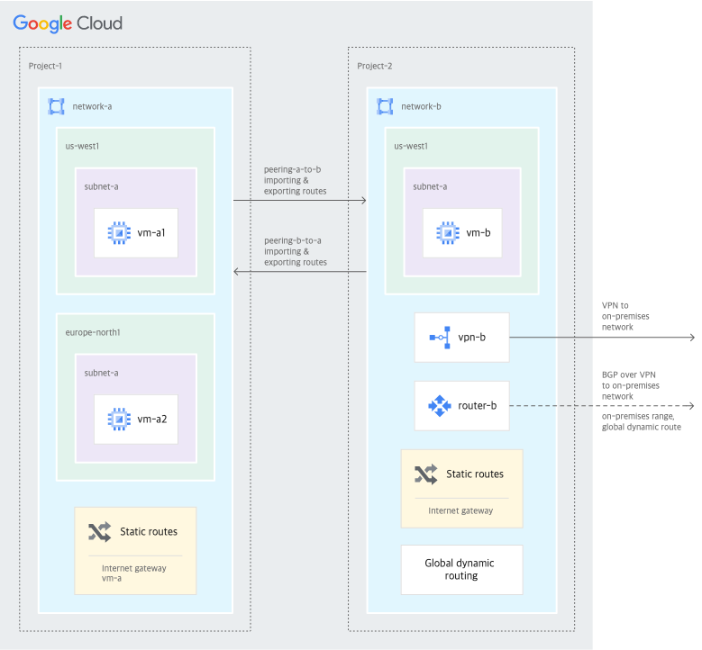 | 피어링 서브넷 경로VPC 네트워크 피어링을 사용하여 연결된 네트워크의 서브넷 IP 주소 범위를 나타냅니다. | 피어 VPC 네트워크피어 네트워크의 VM 및 내부 부하 분산기로 패킷을 전달합니다. | 전체 VPC 네트워크에 적용됩니다.피어 네트워크에서 서브넷이 생성, 수정 또는 삭제되면 Google Cloud에서 자동으로 생성, 업데이트, 삭제합니다. |