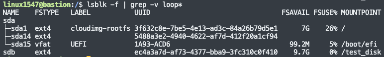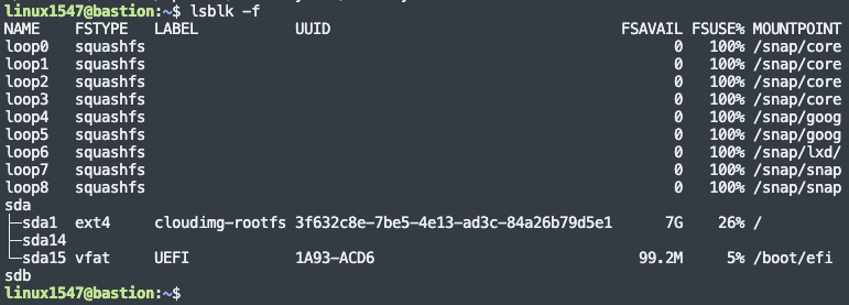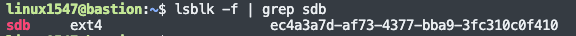 lsblk -f (파일시스템, UUID 항목추가), blkid명령어로 디스크의 UUID를 확보한다.