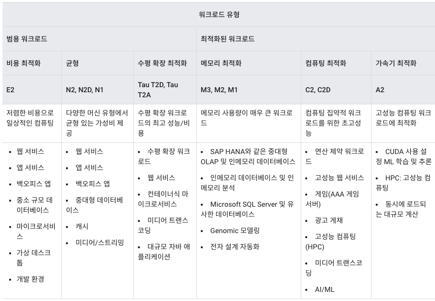 N1, E2, C2등 워크로드 모델에 다라 CPU유형이 다름 다음 링크에 정리가 잘 되어있으니 참조하자