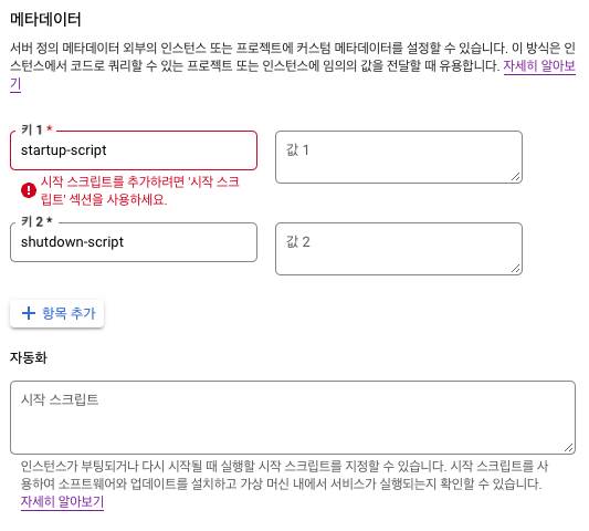 <html><body><p>Linux startup script added directly.</p></body></html>위의 방법 외에도 로컬PC에서 gcloud로 생성