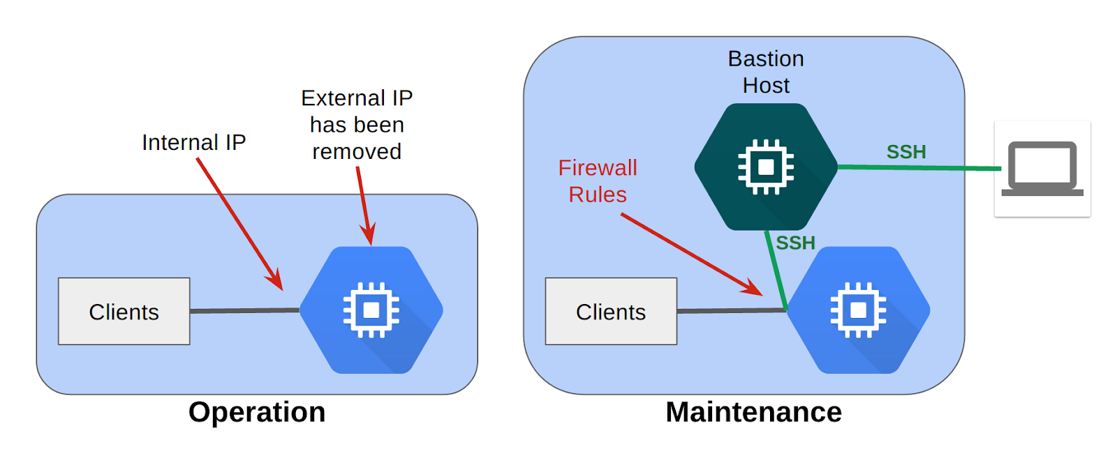 위 그림이 잘 표현을 하였는데, 외부에서 SSH로 접근하고 Bastion Host만이 다시 SSH를 통해 접근을 하는 것을 볼 수 있다. 다른 포트로는 접속 못하게 Firewall Rules로 설정은 필수