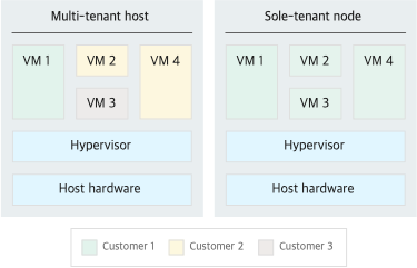 단독 테넌트란 신청시 프로젝트의 VM만 GCP가 보여하고 있는 물리서버에 단독으로 서비스 해주는 서비스 아래 그림을 보면 이해가 쉬운데, 멀티 테넌트의 경우 각 고객들이 GCP가 가진 물리적인 서버를 나누어 서비스를 받으나, 단독 테넌트의 경우 해당 물리적인 서버