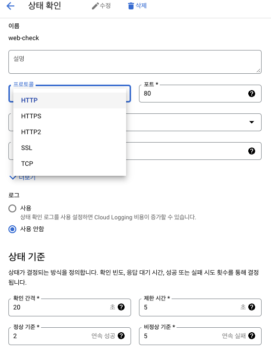백엔드 인스턴스가 트래픽에 제대로 응답하는지 확인하는 상태 확인 카테고리, 프로토콜별로 상태확인을 구성 기존 상태 확인 : 레거시 상태 확인이라고 하며, 백엔드에 보낸 https, http 응답이 HTTP 200 코드로 응답된다면, 성공으로 보는 확인방법 리다이렉션 (301, 302)을 포함한 다른 응답코드는 비정상으로 체크됨 상태 확인 : 위의 기존 상태 확인이 아닌 프로토콜, 범위, 포트, 프로토콜등 각기 필요한 정보를 입력하여 백엔드의 상태를 확인할 수 있음