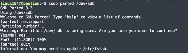 parted 유틸리티를 열고, 아래의 순서대로 진행한다. resizepart 입력 partition number : 1번 입력 현재 파티션이 사용 중인데, 그래도 진행할 것인가? → YES 용량 증가에 따른 100% 입력 후 종료
