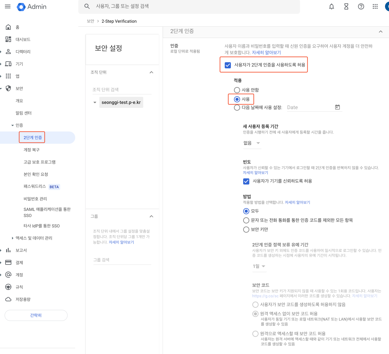admin.google.com 접속하여 아래의 메뉴로 접근합니다. 메뉴 → 보안 → 인증 → 2단계 인증을 선택합니다.