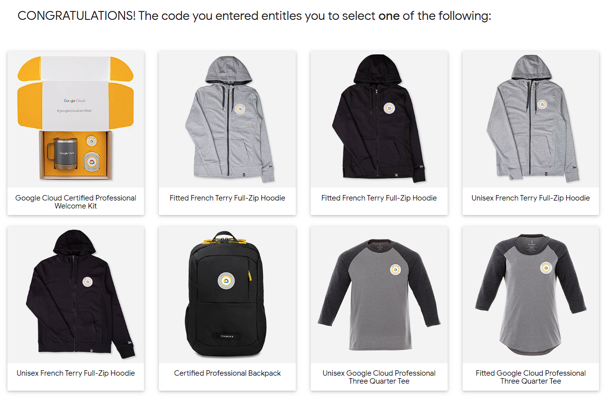 GCP시험에 합격하면, 기념품을 준다. Perks가 특전이라는데... 뭐 자기네들 상품을 살 수 있는 권리를 주는 AWS보다야 훨 낫다. 다만 나도 참 운이 없는게 2022년까지는 후드, 티셔츠, 백팩, 컵등 다양