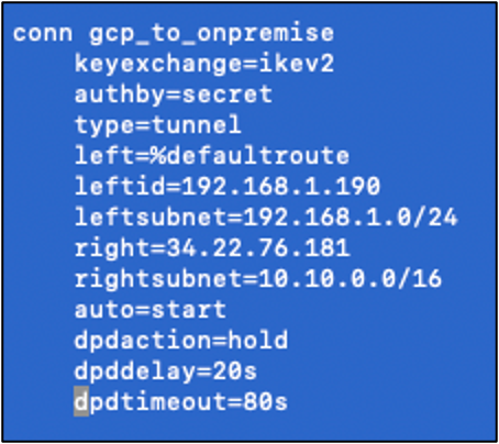 | dpdaction | Dead Peer Detection로 VPN의 상대방(GCP)이 연결 중인지 주기적으로 확인하는 옵션입니다. 본 문서에서는 보류상태인 hold로 선택합니다. |