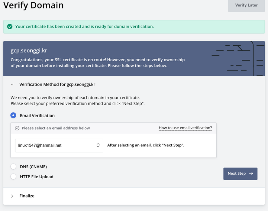 관리자에 대한 E-mail, DNS(Cname), HTTP File Upload를 통해 인증을 지원합니다.