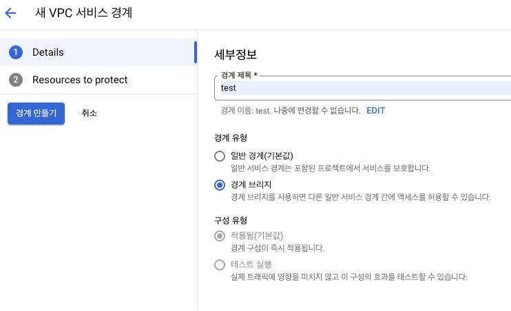 신규 정책 생선시에는 리소스를 필수로 선택하여야 하는데, 본 문서에서는 브리지로 연결할 프로젝트를 포함한 “service-vpc-test” 폴더를 선택하였습니다.