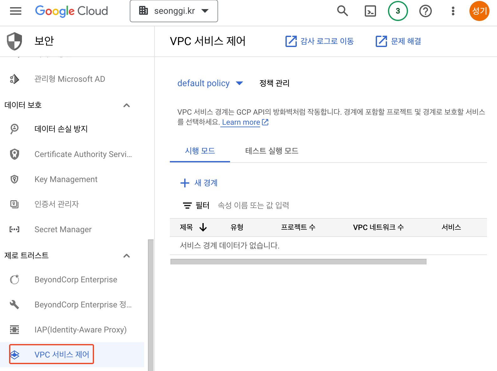 본 문서에서는 “DMZ Project / in-server Project”를 service-vpc-test란 폴더 하위에 같이 두었습니다. - default policy → 정책관리를 선택합니다.