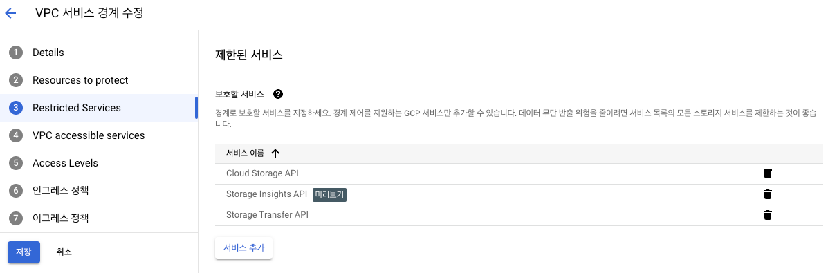 아래는 VPC서비스 경계 생성에 대한 화면이며, 여기서 설정이 필요한 것은 2번(Resources to Protect), 3번(Restricted Services), 6번(인그레스 정책)항목입니다.