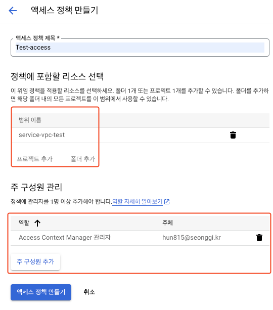 신규 정책 생선시에는 리소스를 필수로 선택하여야 하는데, 본 문서에서는 브리지로 연결할 프로젝트를 포함한 “service-vpc-test” 폴더를 선택하였습니다.