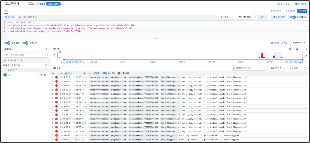 특정 User검색시 : protoPayload.authenticationInfo.principalEmail="사용자ID"