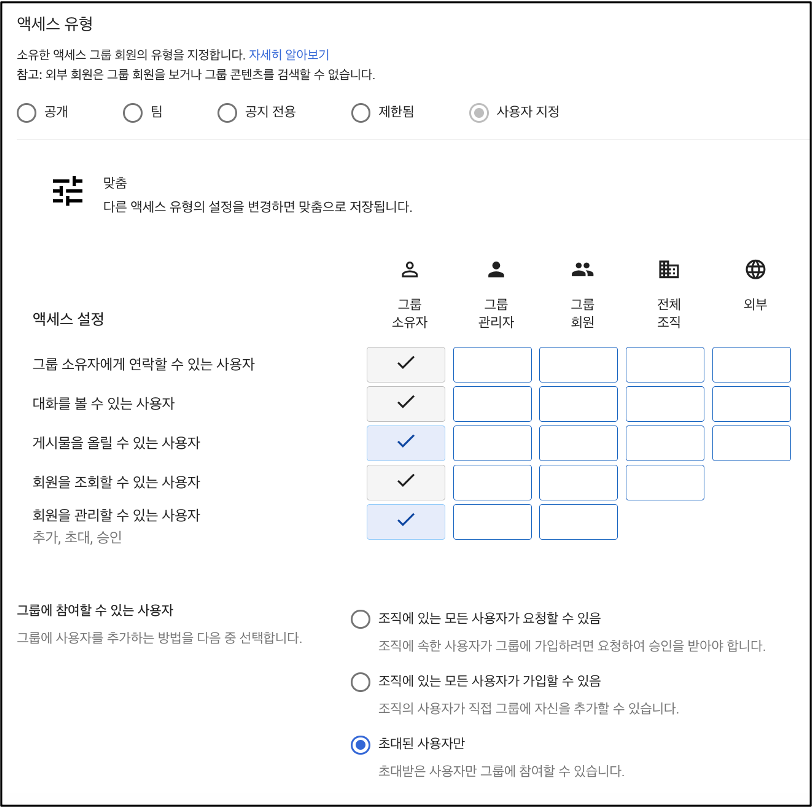 본 문서에서는 그룹소유자는 모두 가능, 그 외 사용자는 그룹 소유자가 초대했을 때만 가입이 가능하도록 설정하였습니다.