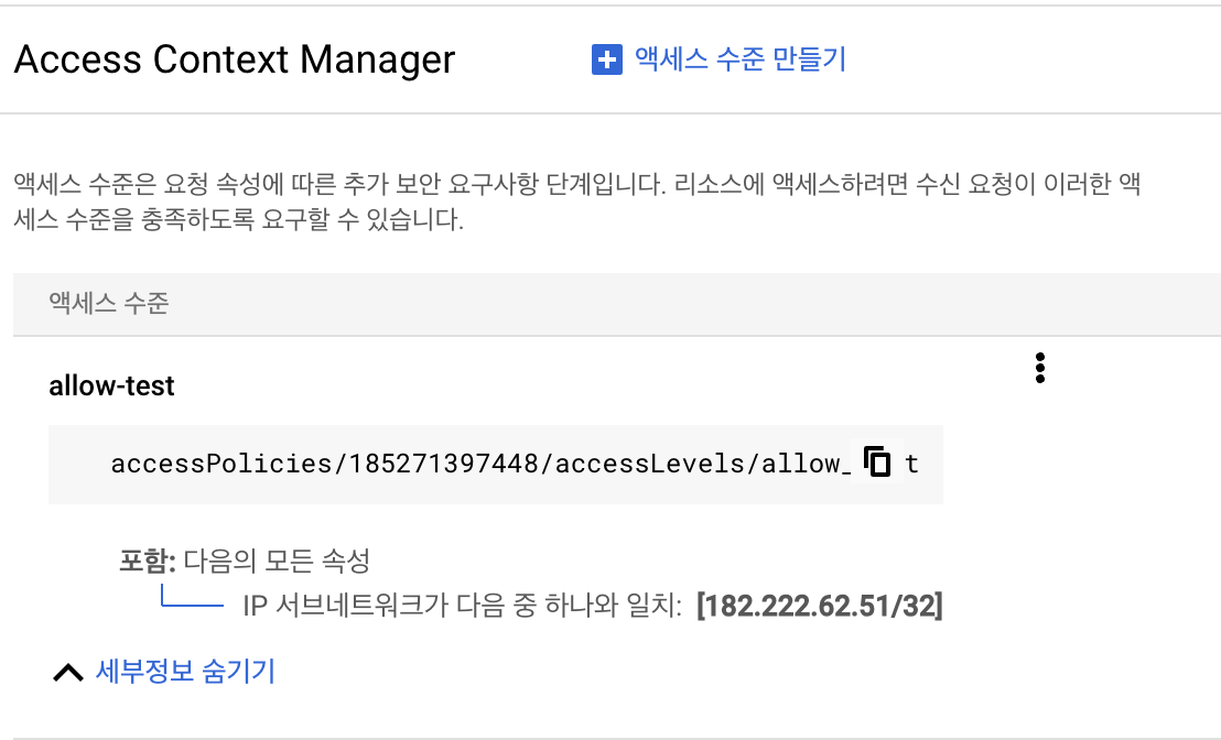 이제 허가된 외부장소의 IP 값이 있는 “Access Context”가 생성이 되었습니다.