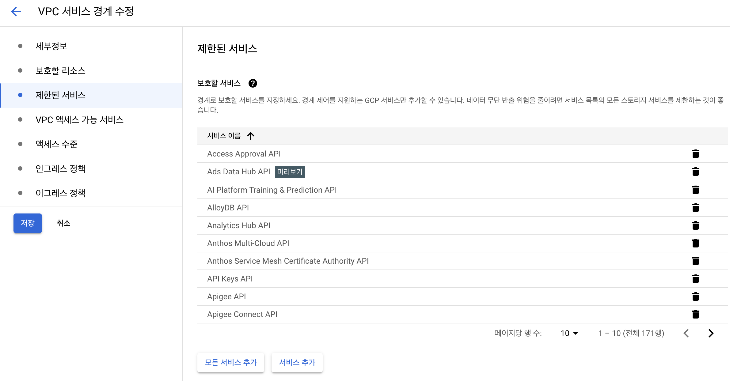 VPC서비스 제어는 GCP서비스 리소스에 대해 상세하게 제한하는 설정이 가능합니다.