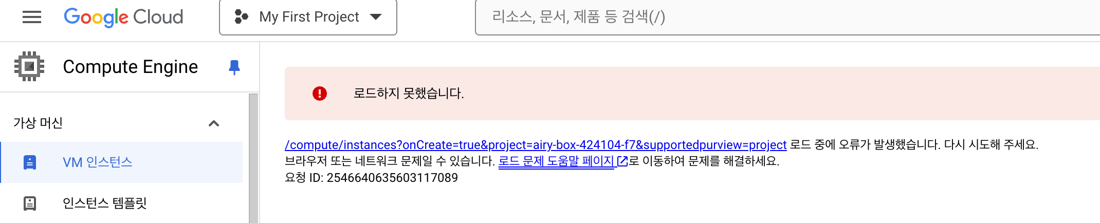 규칙 1에 적용된 대로 허가된 장소와 테스트 ID-1로 접속 후 “Compute Engine”을 접속 시도시 아래와 같이 에러메시지가 발생됩니다.