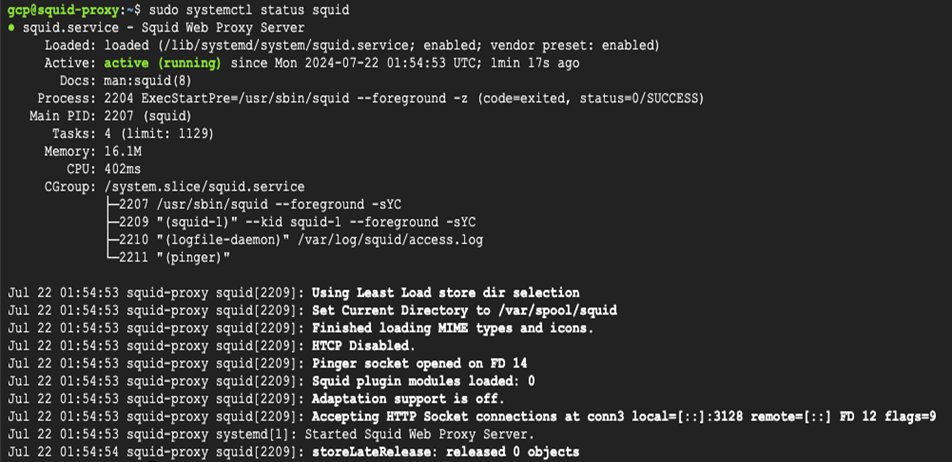 | sudo systemctl status squid | Squid 프로그램 상태 확인 Active (running)면 동작임을 확인할 수 있음 |