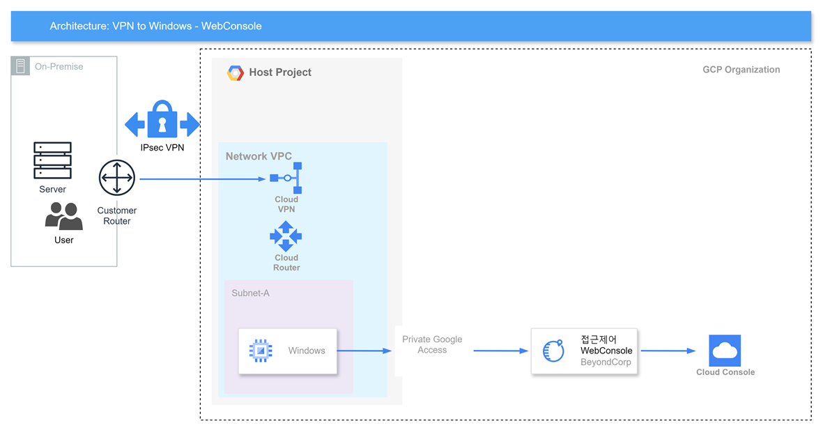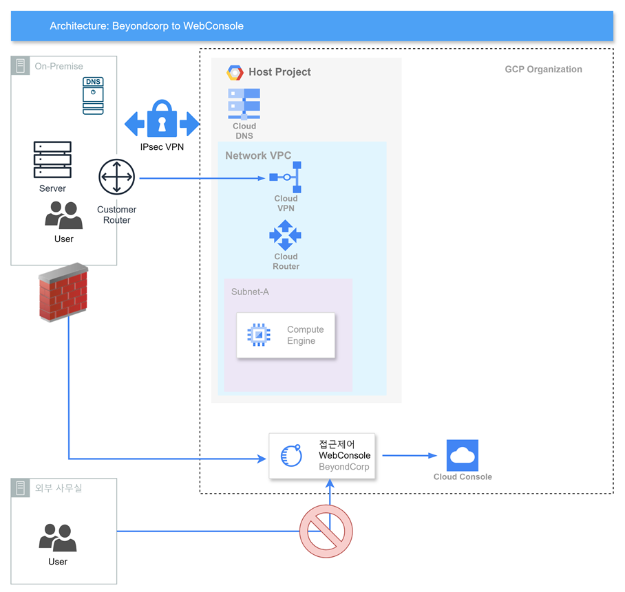 트래픽 흐름은 사용자 -> VPN -> VM -> BeyondCorp 접근제어 -> Console 로 접근합니다.