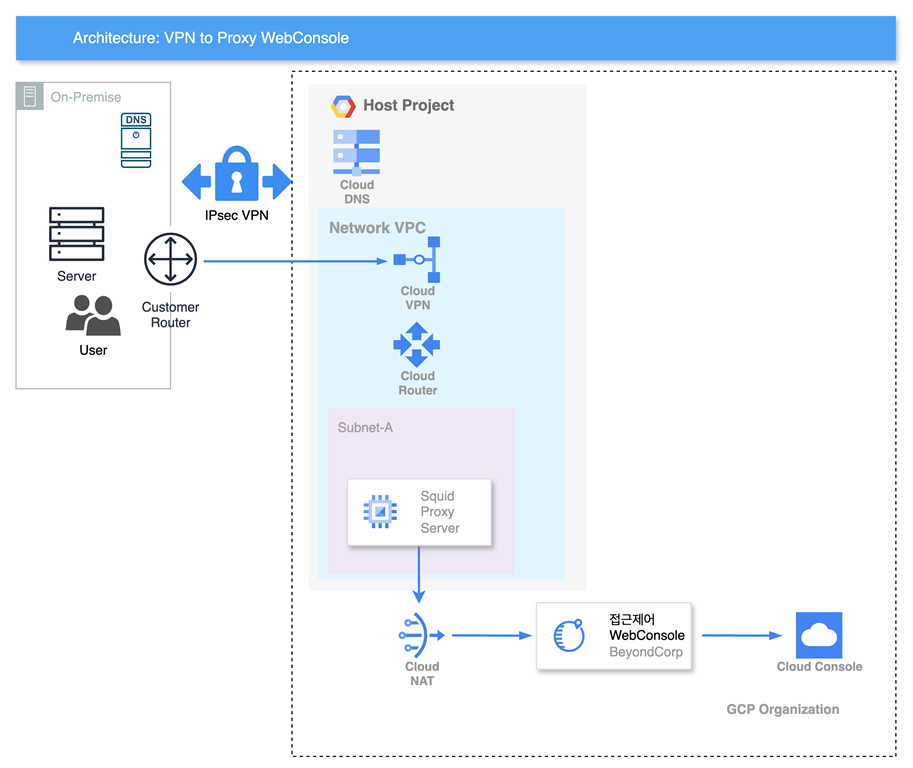흐름은 사용자 -> VPN -> Squid Proxy -> NAT -> BeyondCorp 접근제어 -> Console 로 접근하는 방안입니다.