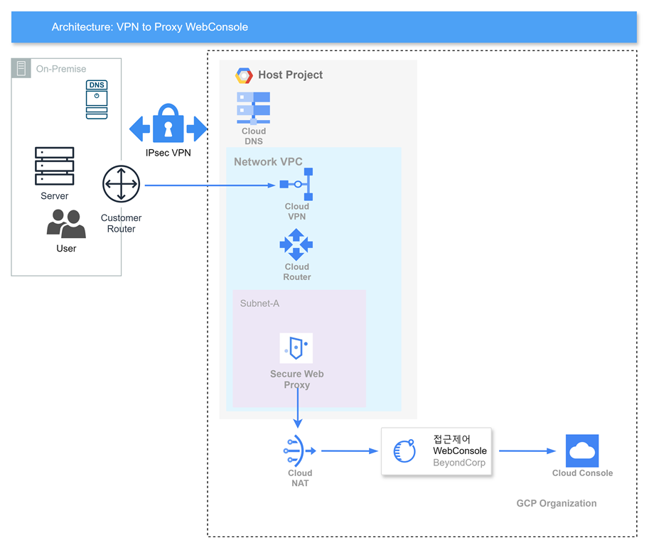트래픽 흐름은 사용자 -> VPN -> Secure Web Proxy -> NAT -> BeyondCorp 접근제어 -> Console 로 접근합니다.