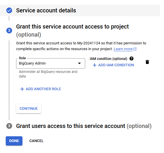 본 테스트 문서에서는 연결 테스트 이므로 BigQuery Admin으로 설정하였습니다.