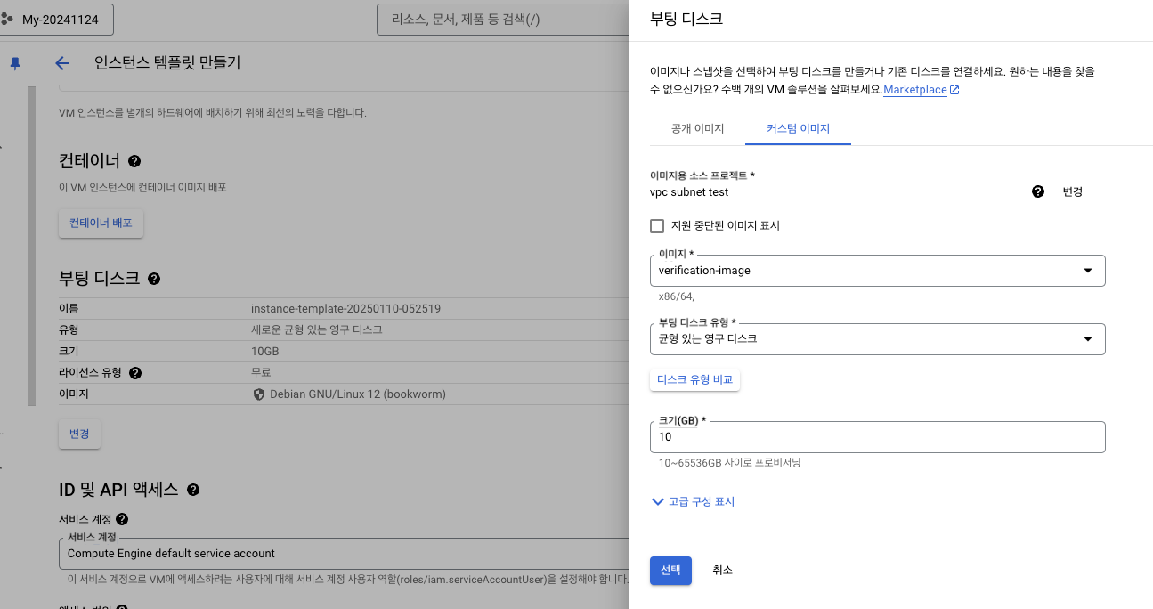운영 프로젝트인 “My-20241124” 에서 검증 프로젝트인 “vpc subnet test(linen-works-443108-k2)”의 이미지를 확인이 가능하며 해당 이미지로 VM 생성을 할 수 있습니다.