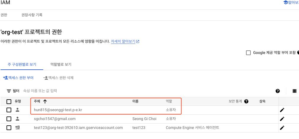 1. 개인 Gmail로 생성한 프로젝트의 IAM및관리자 → IAM 으로 이동하여, 조직ORG에 속한 사용자에게 소유자 권한을 부여합니다.