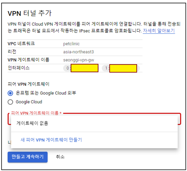 피어 VPN 게이트웨이 인터페이스를 생성한 후에는 VPN터널 생성으로 진입합니다.