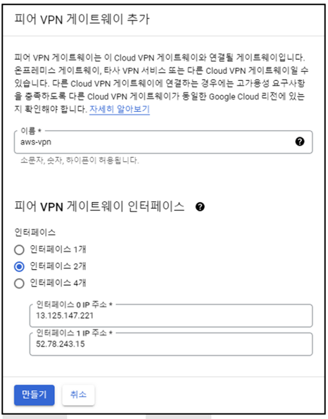 단 이때에 사전에 피어 VPN게이트웨이가 4개로 되어있어야 합니다.