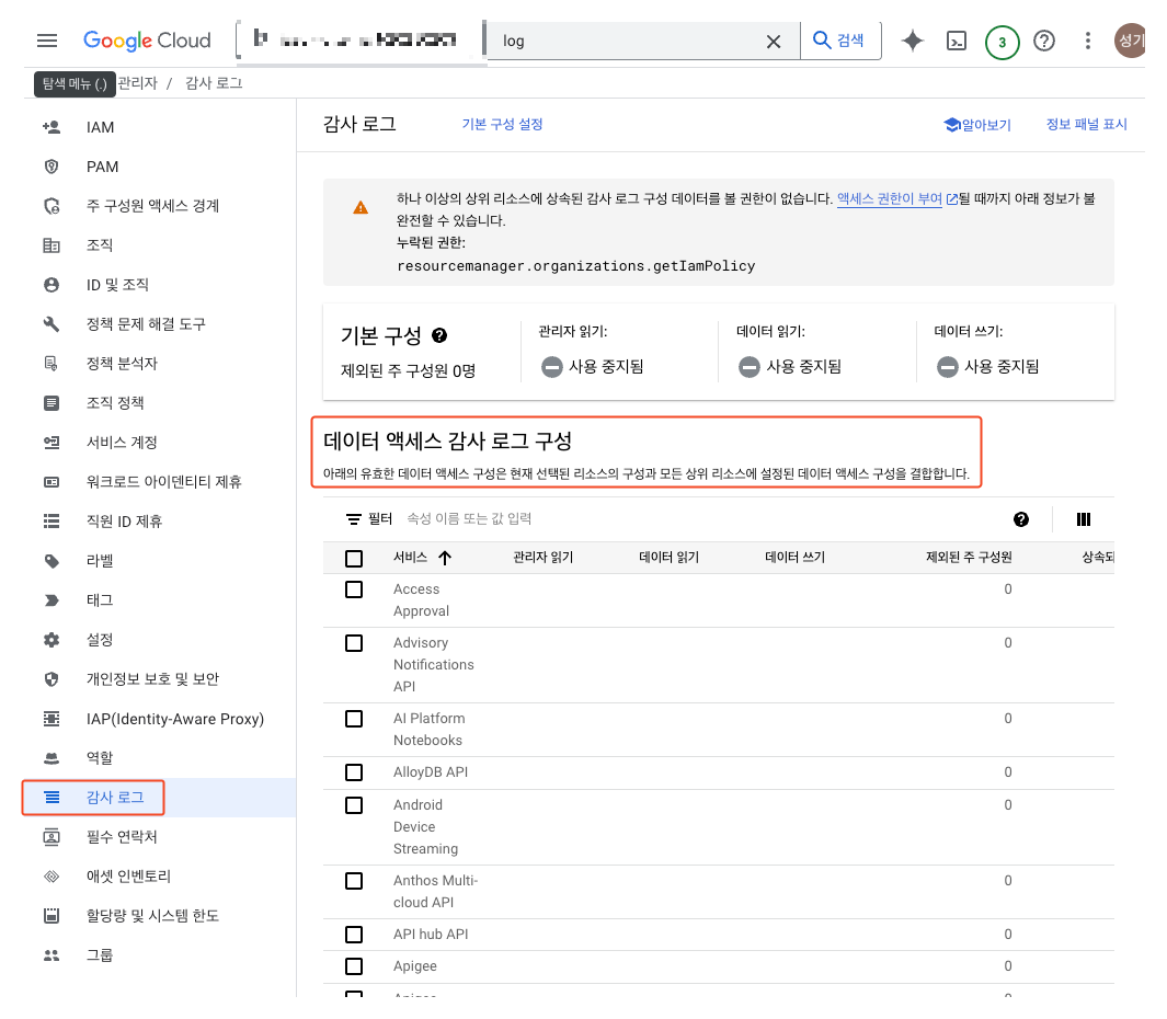많은 로그가 생성되는 사유로 기본적으로는 사용 중지가 되어있습니다. IAM → 감사 로그로 이동합니다.