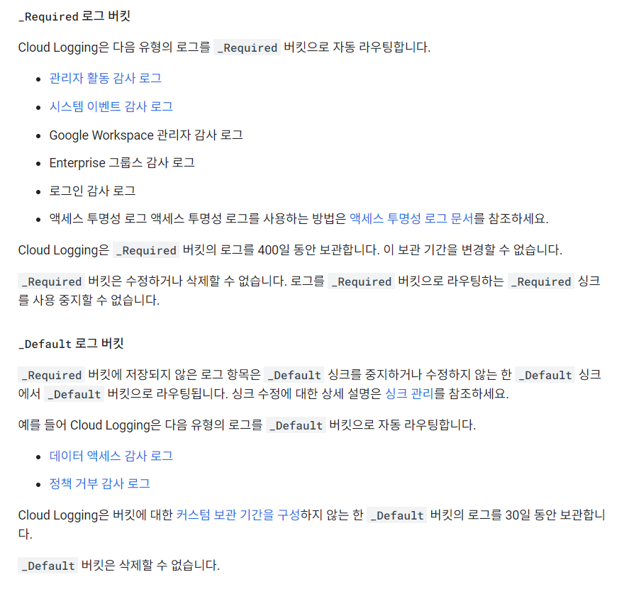 GCP의 감사로그는 _Required, _ Default 2개로 Bucket에 저장되도록 구성되어 있습니다.