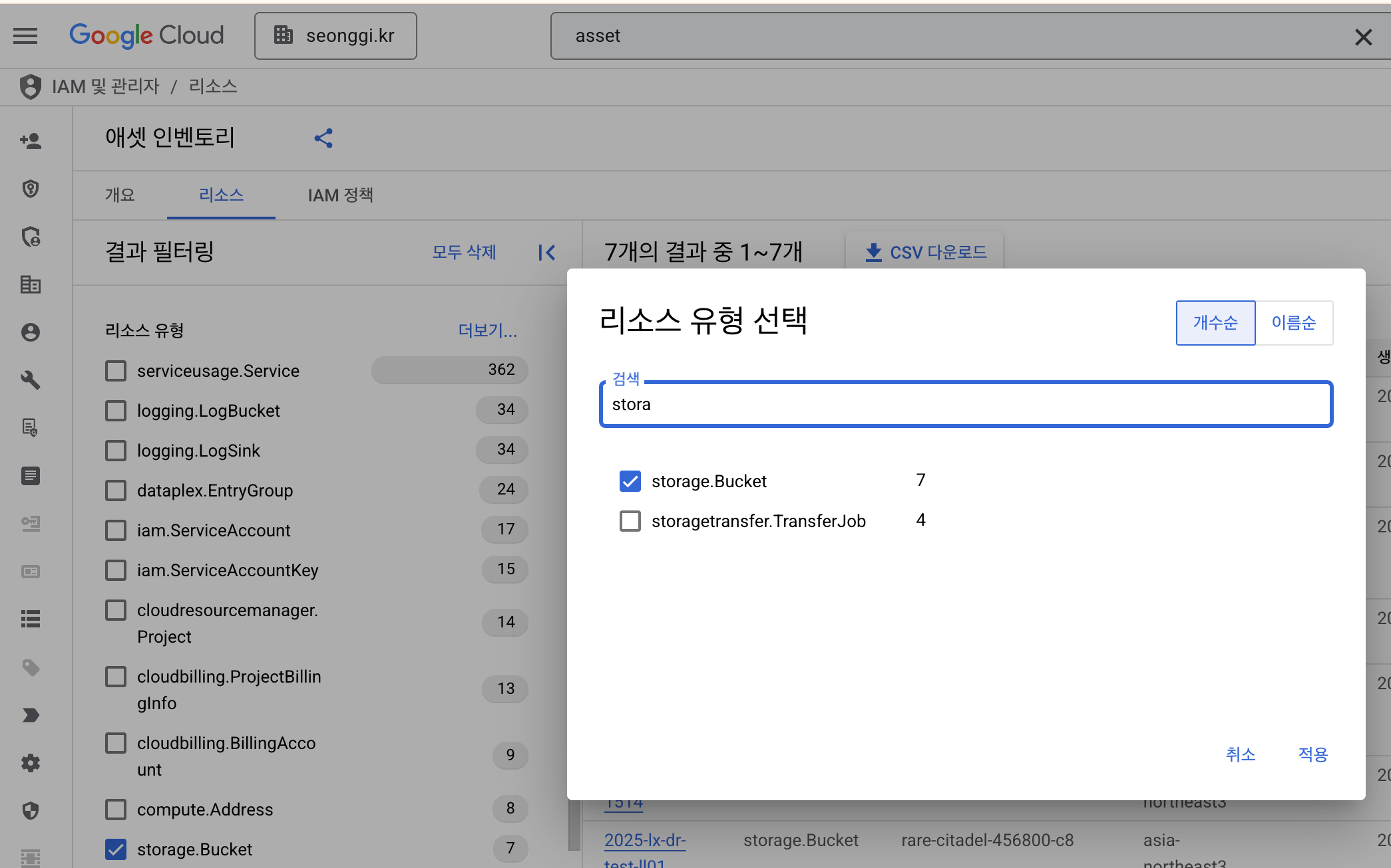 조직 선택 후→ storage.Bucket 으로 리소스 필터