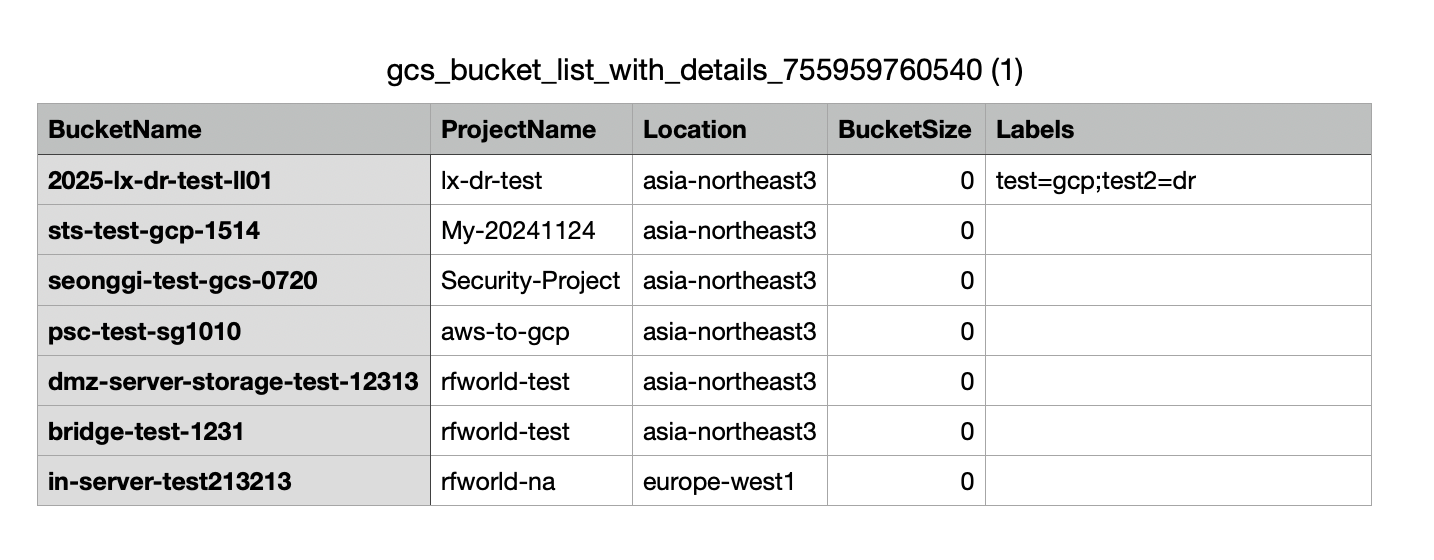 # --- 2단계: 버킷 목록 조회 및 크기 조회 (gsutil 사용), 결과 조합 ---