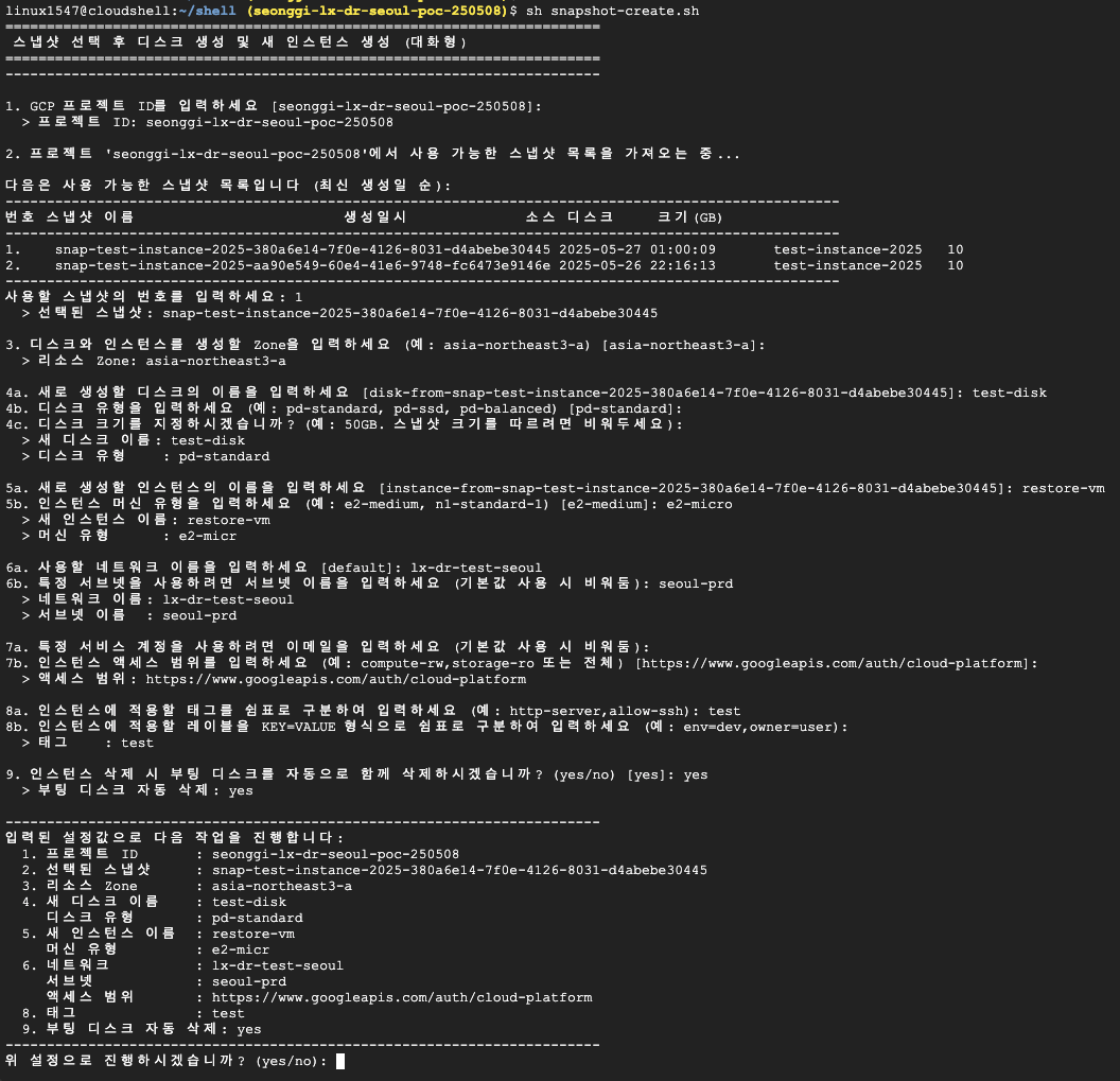 CLI (gcloud+shell script) 방안 한두 대의 VM을 생성하는 경우 GUI가 직관적이지만, 다수의 VM을 빠르게 생성해야 하거나 반복적인 작업을 자동화해야 할 때 CLI 방식이 매우 효과적입니다. 이 문서에서 제공하는 쉘 스크립트는 대화형으로 진행되며, GCP 프로젝트 ID, 사용할 스냅샷, Zone 등의 정보를 입력받아 새 디스크를 생성하고, 해당 디스크를 사용하여 새 VM 인스턴스를 만듭니다. 네트워크, 태그, 지역 등 VM 생성 시 필요한 여러 설정값에 대해 기본값이 제안되며, Enter 키를 누르면 기본값이 사용되도록 하여 편의성을 높였습니다. 스크립트 실행 후, 생성된 VM에 바로 접속할 수 있는 gcloud compute ssh 명령어도 출력해줍니다. 스크립트 주요 입력 항목 1. GCP 프로젝트 ID: 기본 프로젝트 ID가 있다면 자동으로 제안됩니다. 2. 사용할 스냅샷 선택: 프로젝트 내 사용 가능한 스냅샷 목록이 최신 생성일 순으로 표시되며, 번호로 선택합니다 3. 리소스 Zone: 디스크와 인스턴스를 생성할 Zone을 입력합니다 (예: asia-northeast3-a). 4. 새 디스크 정보: 디스크 이름 (예: test-disk). 디스크 유형 (예: pd-standard, pd-ssd, pd-balanced). 디스크 크기 (비워두면 스냅샷 크기를 따름). 5. 새 인스턴스 정보: 인스턴스 이름 (예: restore-vm). 인스턴스 머신 유형 (예: e2-medium, e2-micro). 6. 네트워크 정보: 네트워크 이름 (예: default 또는 사용자 정의 네트워크 ix-dr-test-seoul). 서브넷 이름 (선택 사항, 예: seoul-prd). 7. 서비스 계정 및 액세스 범위 (선택 사항): 서비스 계정 이메일 액세스 범위 (기본값: https://www.googleapis.com/auth/cloud-platform ) 8. 태그 및 레이블 (선택 사항): 인스턴스 태그 (쉼표로 구분, 예: http-server,allow-ssh). 인스턴스 레이블 (KEY=VALUE 형식, 쉼표로 구분, 예: env=dev,owner=user). 9. 부팅 디스크 자동 삭제: 인스턴스 삭제 시 부팅 디스크 자동 삭제 여부 (yes/no). 최종 확인 및 실행: 모든 입력 값을 지정한 후, 최종 설정값을 확인하고 진행 여부를 결정합니다. 스크립트 내부 주요 gcloud 명령어: