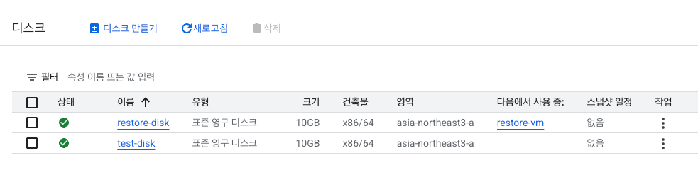 디스크 생성: gcloud compute disks create "[NEW_DISK_NAME]" --source-snapshot="[SOURCE_SNAPSHOT_NAME]"