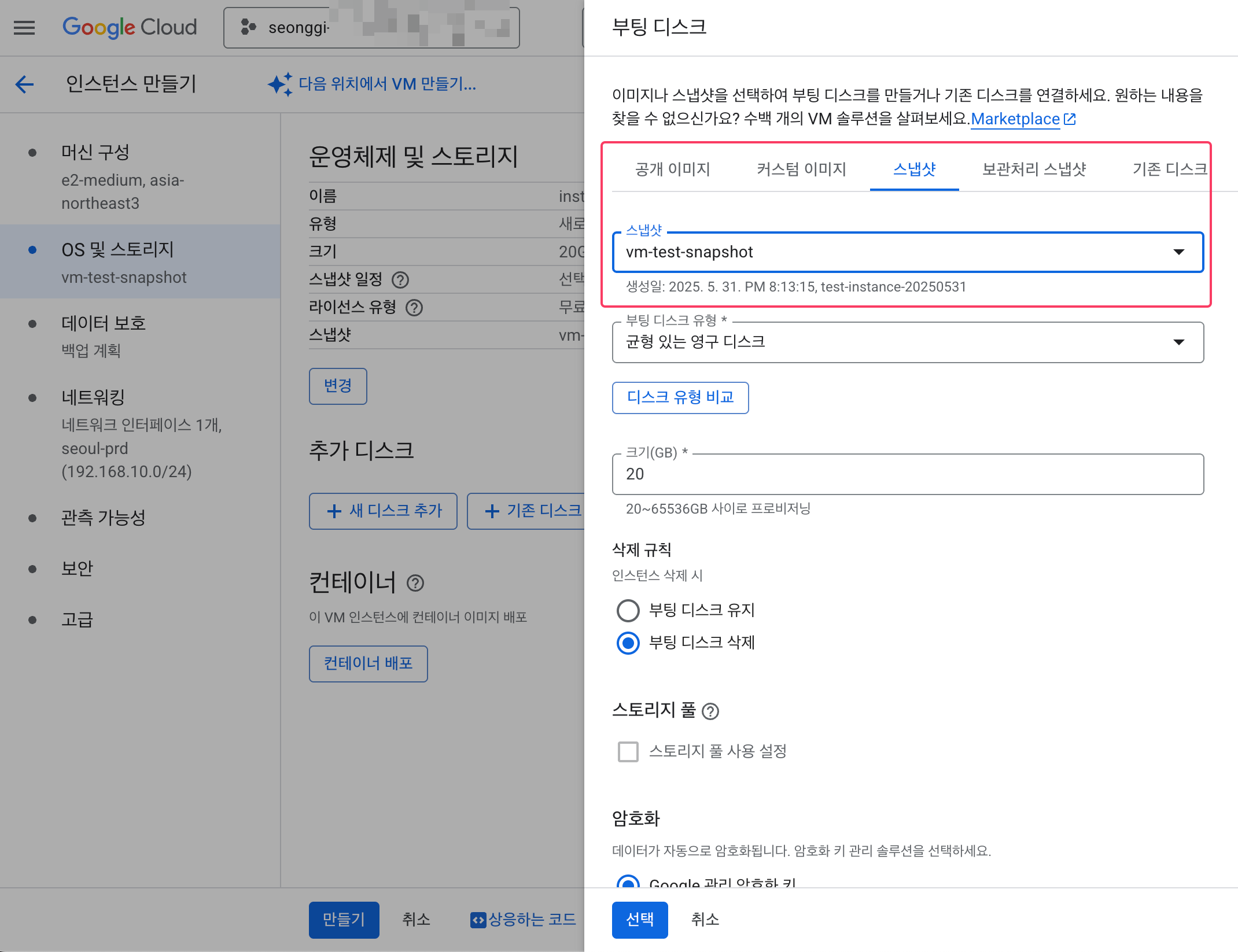 방법 2: VM 생성 과정에서 부팅 디스크로 스냅샷을 직접 선택 (권장). 이 방법은 GCP가 자동으로 디스크 생성 및 연결을 처리해줍니다. 'Compute Engine' -> 'VM 인스턴스' -> '인스턴스 만들기'로 이동합니다. '운영체제 및 스토리지' 에서 부팅 디스크 '변경'을 클릭합니다. 상단 탭에서 '스냅샷'을 선택합니다. 필요한 경우 디스크 유형, 크기 등을 조정한 후 나머지 VM 설정을 완료하고 인스턴스를 생성합니다.
