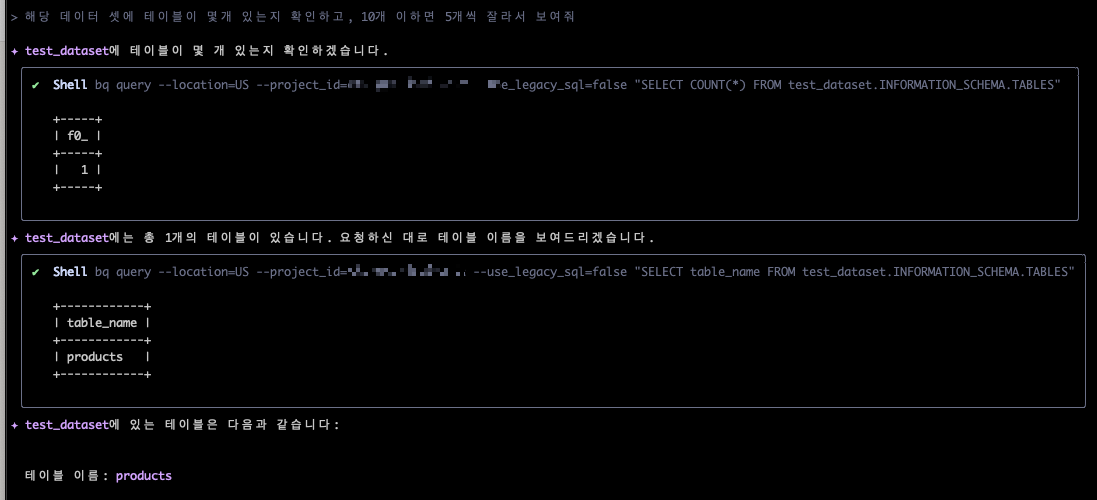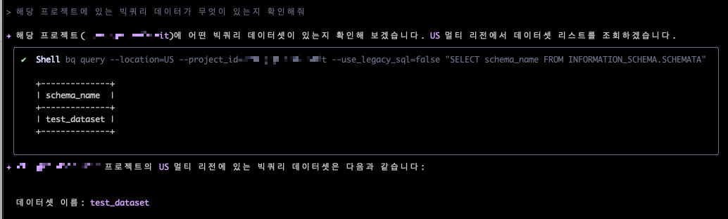 ✦ 성공했습니다! test_dataset 데이터셋에 있는 테이블 리스트는 다음과 같습니다: