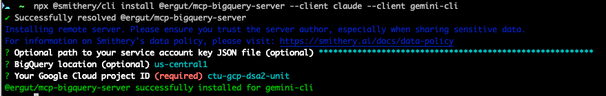 아래의 명령어를 통해 서버를 설치합니다. 아래 3개 항목에 대해 확인을 합니다. SA json파일은 빈란으로 두어도 무방하며, 나머지 bigquery 위치와 GCP 프로젝트를 설정합니다.