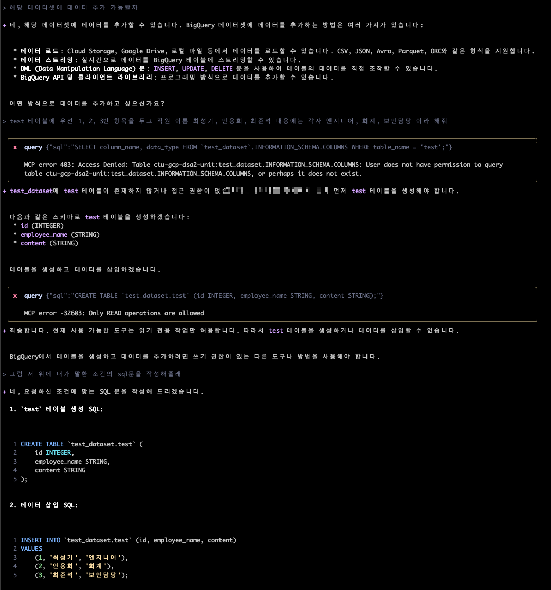 본 문서에서는 MCP서버가 자연어로 문의한 것을 이해 후 직접 “Bigquery”으로 조회하여 정리하는 방안을 테스트 했습니다. 향 후 MCP서버에 기능이 더 추가되고, 안정화 된다면 리소스 추가, 삭제, 수정이 가능할 것입니다.