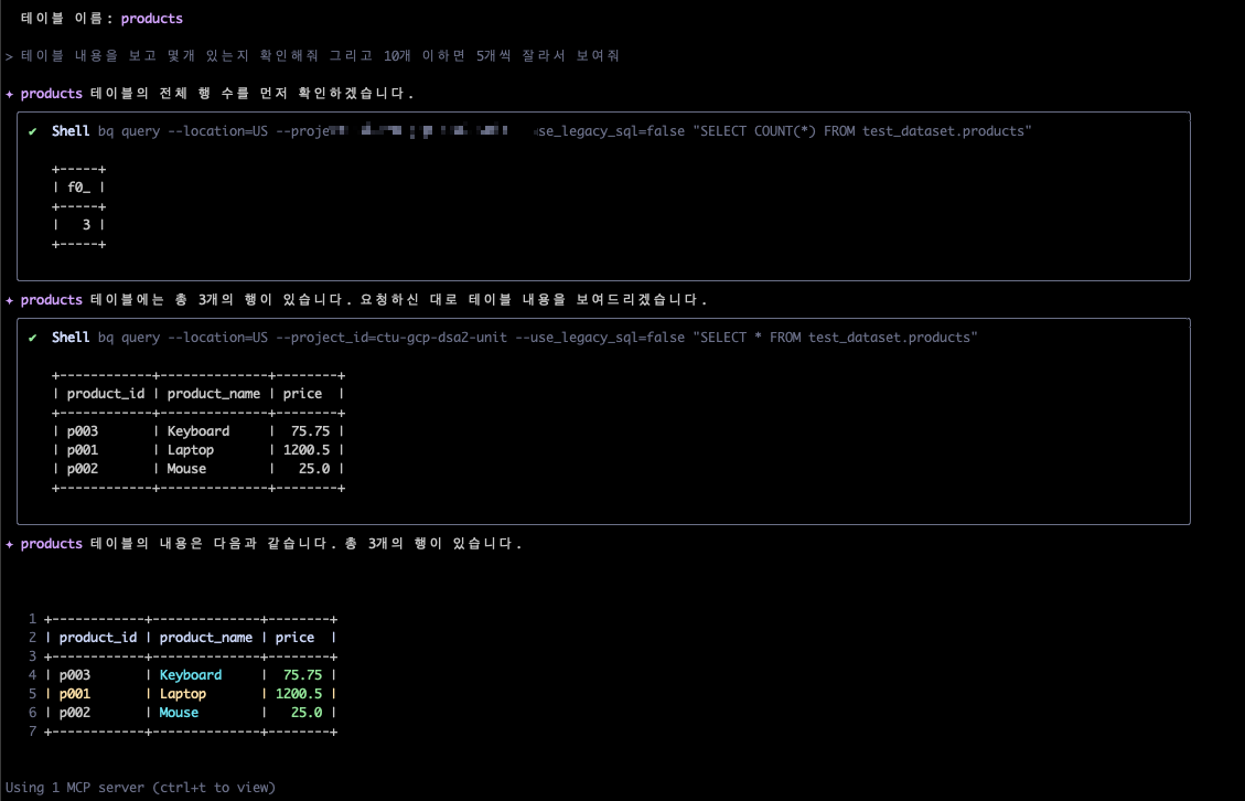 │ ✔ Shell bq query --location=US --project_id=ctu-gcp-dsa2-unit --use_legacy_sql=false "SELECT COUNT(*) FROM test_dataset.products" │