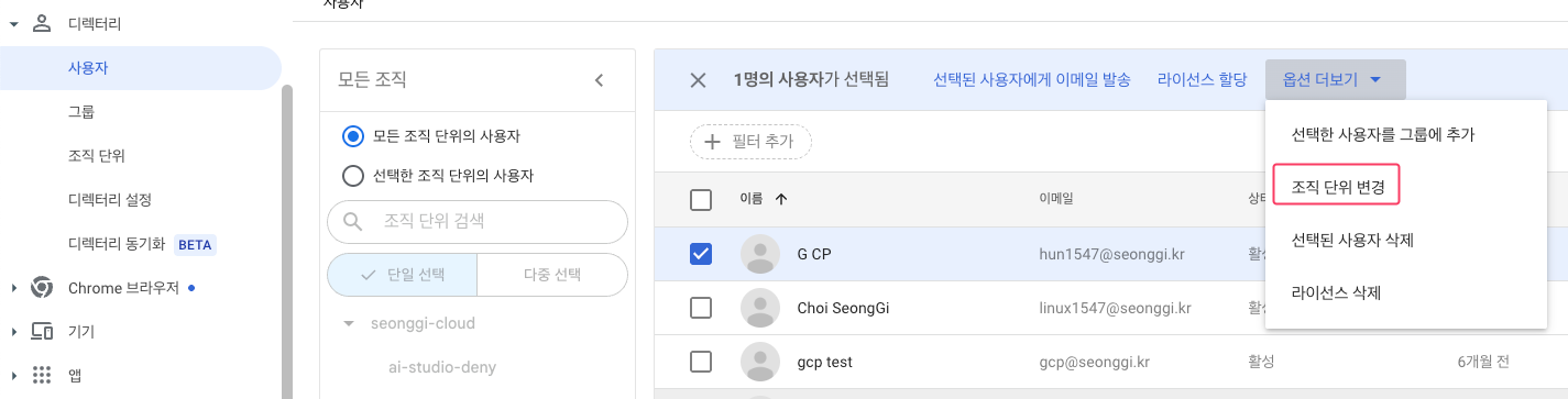 선택 후 오른쪽 상단 “옵션 더보기"에서 조직 단위 변경을 선택합니다.