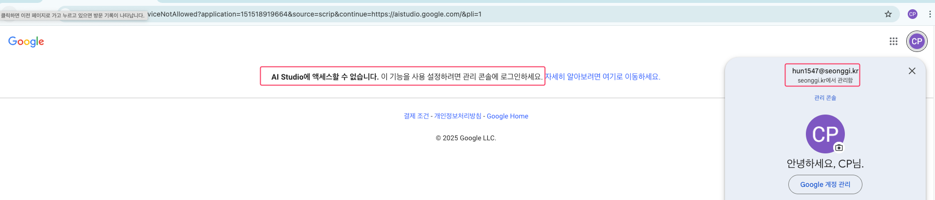 해당 사용자가 로그인 된 상태로 https://aistudio.google.com/ 이동하면 아래 화면과 같이 액세스 할 수 없다는 메시지와 함께 접근이 차단됩니다.