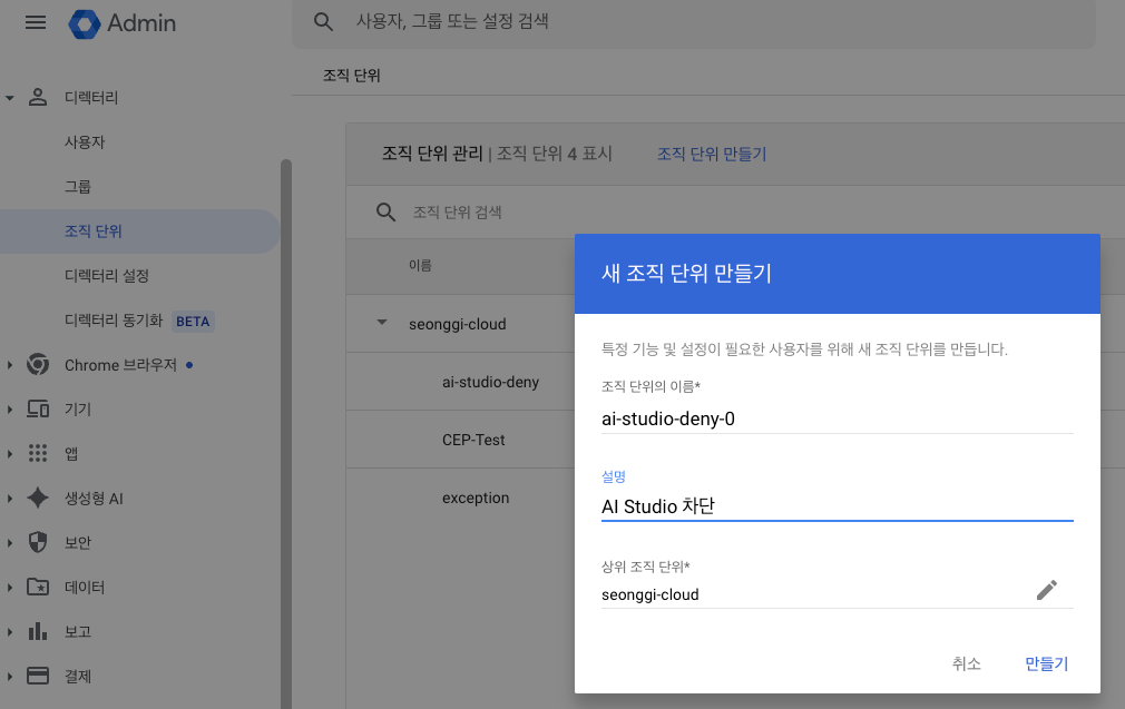 아까 생성한 “ai-studio-deny” 조직을 선택합니다.