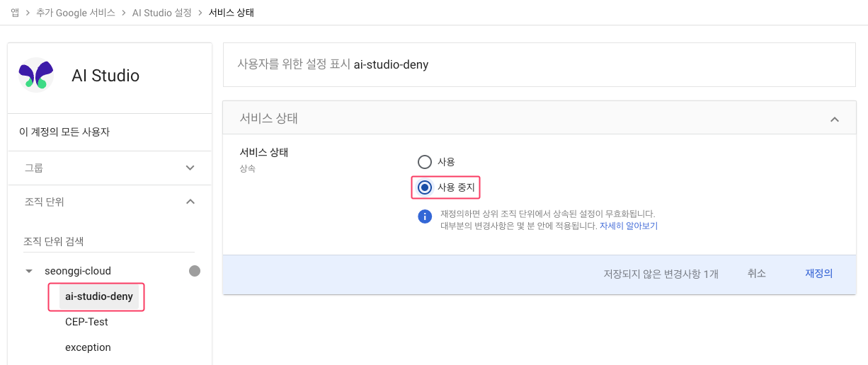 왼쪽 조직 단위 검색에서 차단하고자 하는 “ai-studio-deny”를 선택하고