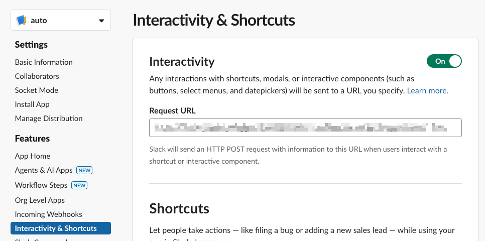 Interactivity (슬랙 메시지 내에서 사용자가 버튼 클릭, 메뉴 선택 등 상호작용을 할 때, 그 이벤트를 슬랙이 지정한 서버(웹훅 URL)로 전달해 주도록 하기 위한 기능)