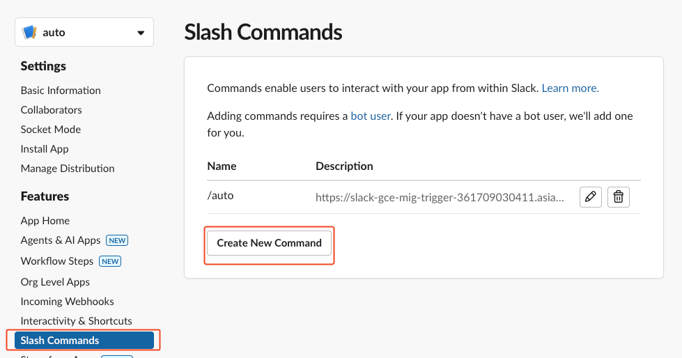 원하는 커맨드(/auto 등) 추가 후 Request URL 설정