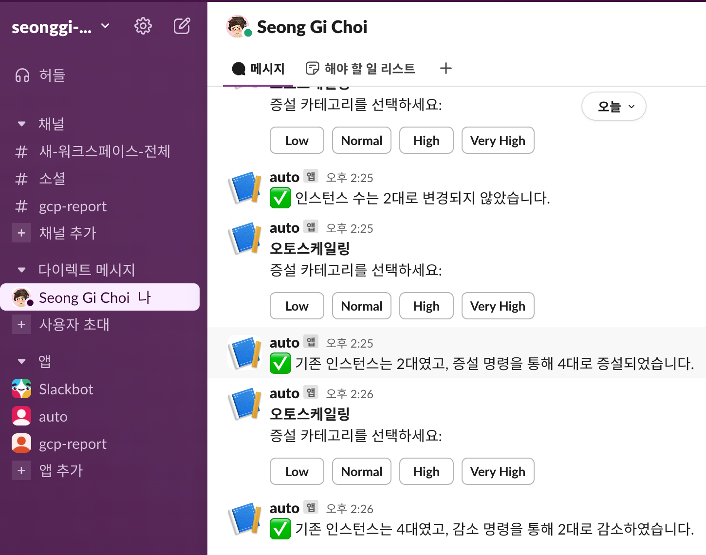 증설/감소 시 현 상태(기존 인스턴스 수 → 변경 후 인스턴스 수)를 명확하게 Slack으로 안내받아 실시간 모니터링 효과까지 볼 수 있습니다.