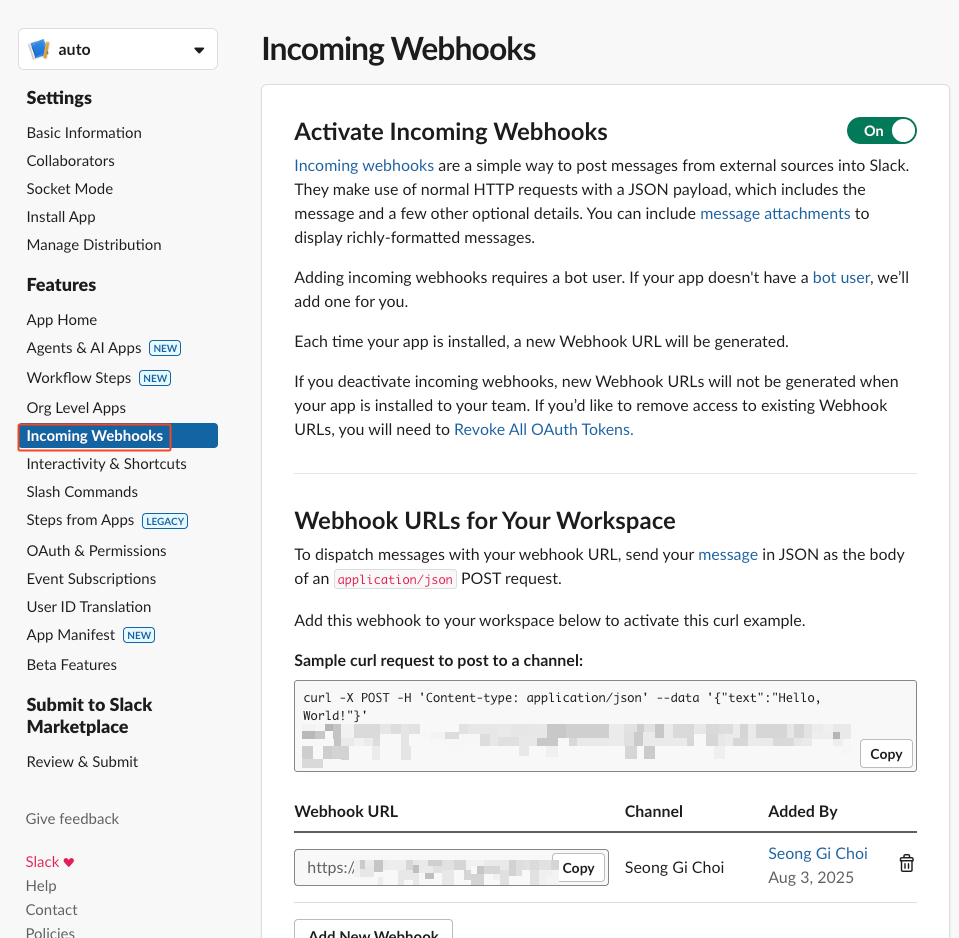 Scope 이름 용도 요약 commands 슬래시 커맨드(/auto 등) 등록 및 사용 incoming-webhook Webhook 방식으로 슬랙 채널에 메시지 전송 chat:write 봇이 슬랙 채널/DM에 메시지 보내기 - Incoming Webhooks : auto Scaling가 완료된 후 Slack Webhook(채널/DM)로 결과 메시지를 받기 위한 설정